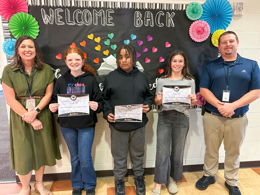 Ernest Ward Middle School recently named their employee and student of the month for August. Pictured (L-R) with Principal Tyvanna Boulanger are students Nevaeh Tidd, eighth grade; Zane Therrell, seventh grade; Hadley Cook, sixth grade; and Wesley Stafford, technology coordinator. Photos for NorthEscambia.com, click to enlarge.