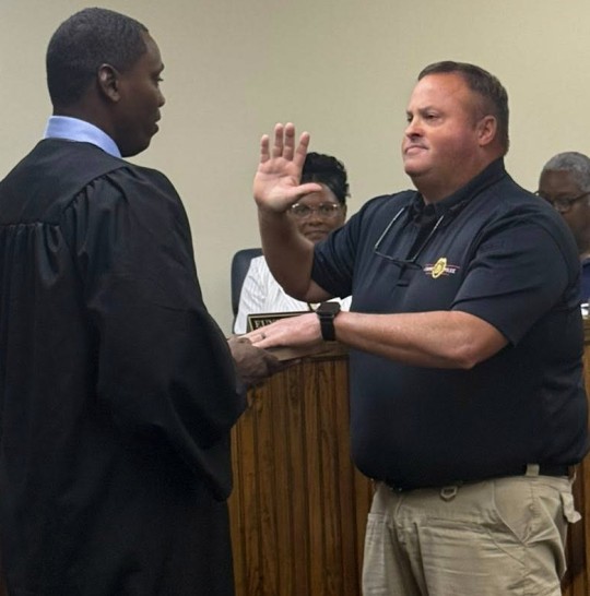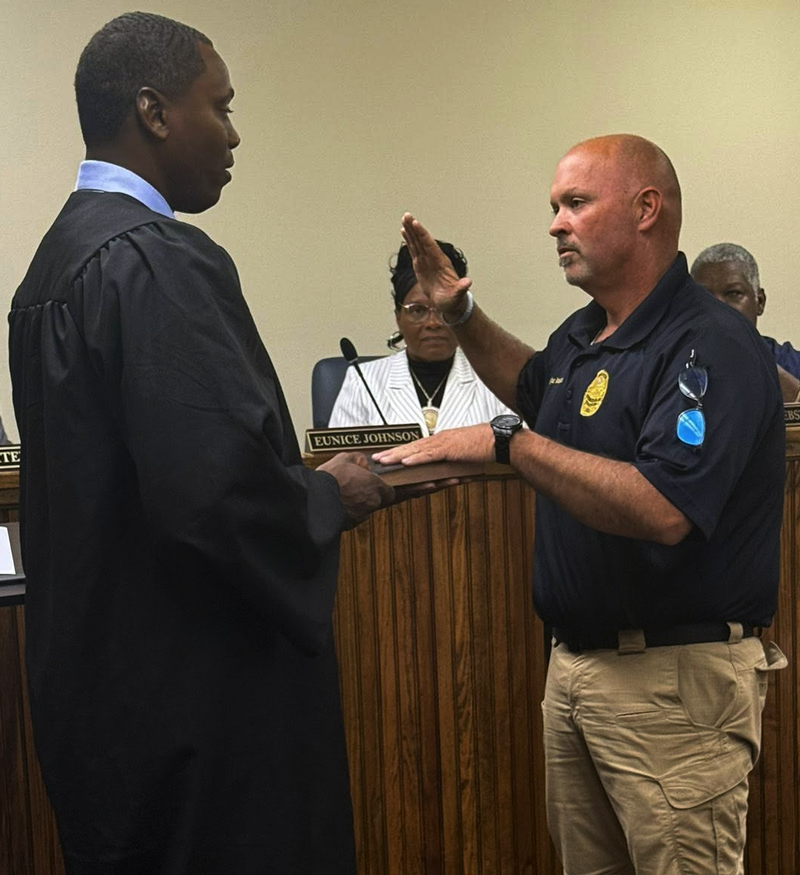 Pictured: Atmore City Magistrate Kaurean Reynolds swears in new Atmore Police Chief Ken Sessions (top) and Director of Public Safety Chuck Brooks (below). Photos for NorthEscambia.com, click to enlarge.