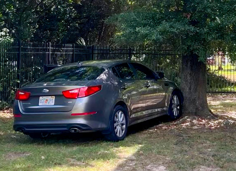 Grice’s flight ended violently when the Kia crashed into a tree behind an apartment complex off Prieto Drive. Undeterred by the wreck, Grice bailed out of the vehicle and fled on foot, scaling a fence and ignoring deputies’ repeated commands to stop.