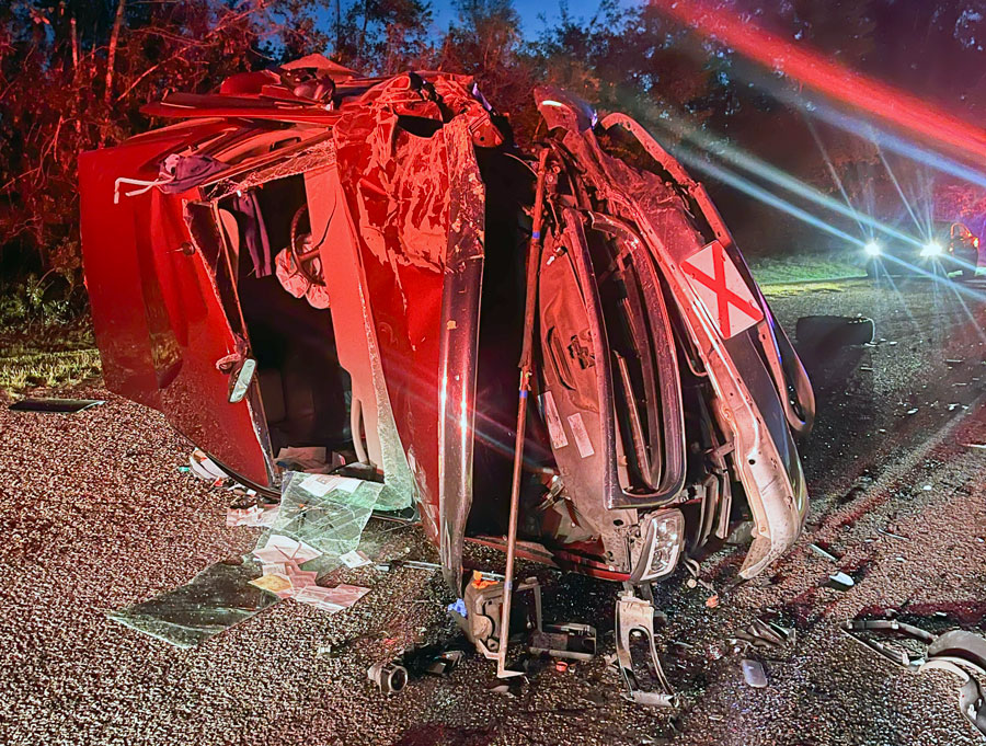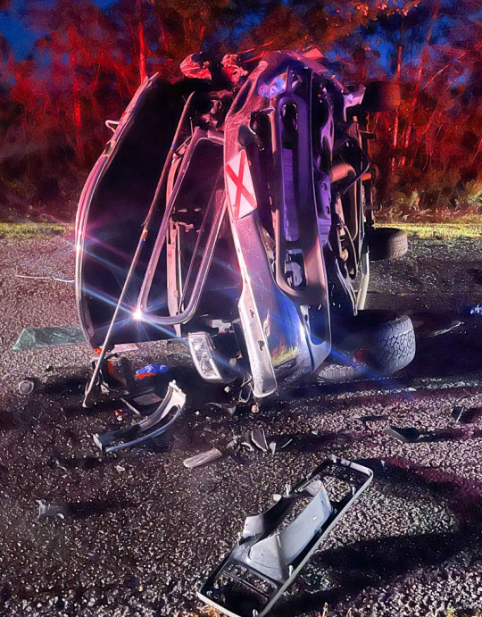 The at-fault pickup driven by the 50-year-old, overturned and landed on its passenger side, blocking Tedder Road. The second pickup came to a stop on the side of the road.
