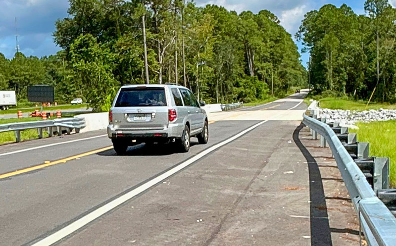 The newly reconstructed bridge features two 10-foot travel lanes (one in each direction), 5-foot paved shoulders, and new traffic railing that meets current standards.