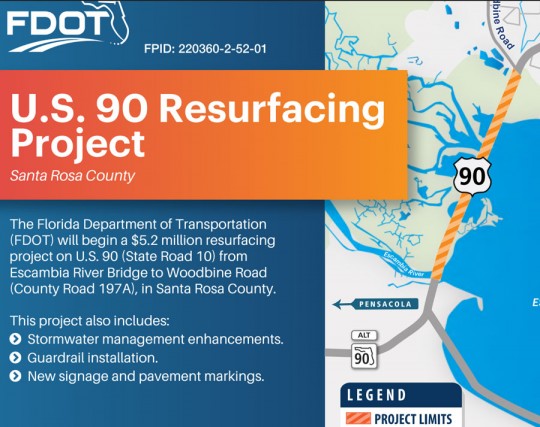 The Florida Department of Transportation (FDOT) will soon begin a $5.2 million resurfacing project on Highway 90 from the Escambia River Bridge to Woodbine Road (County Road 197A) in Santa Rosa County.