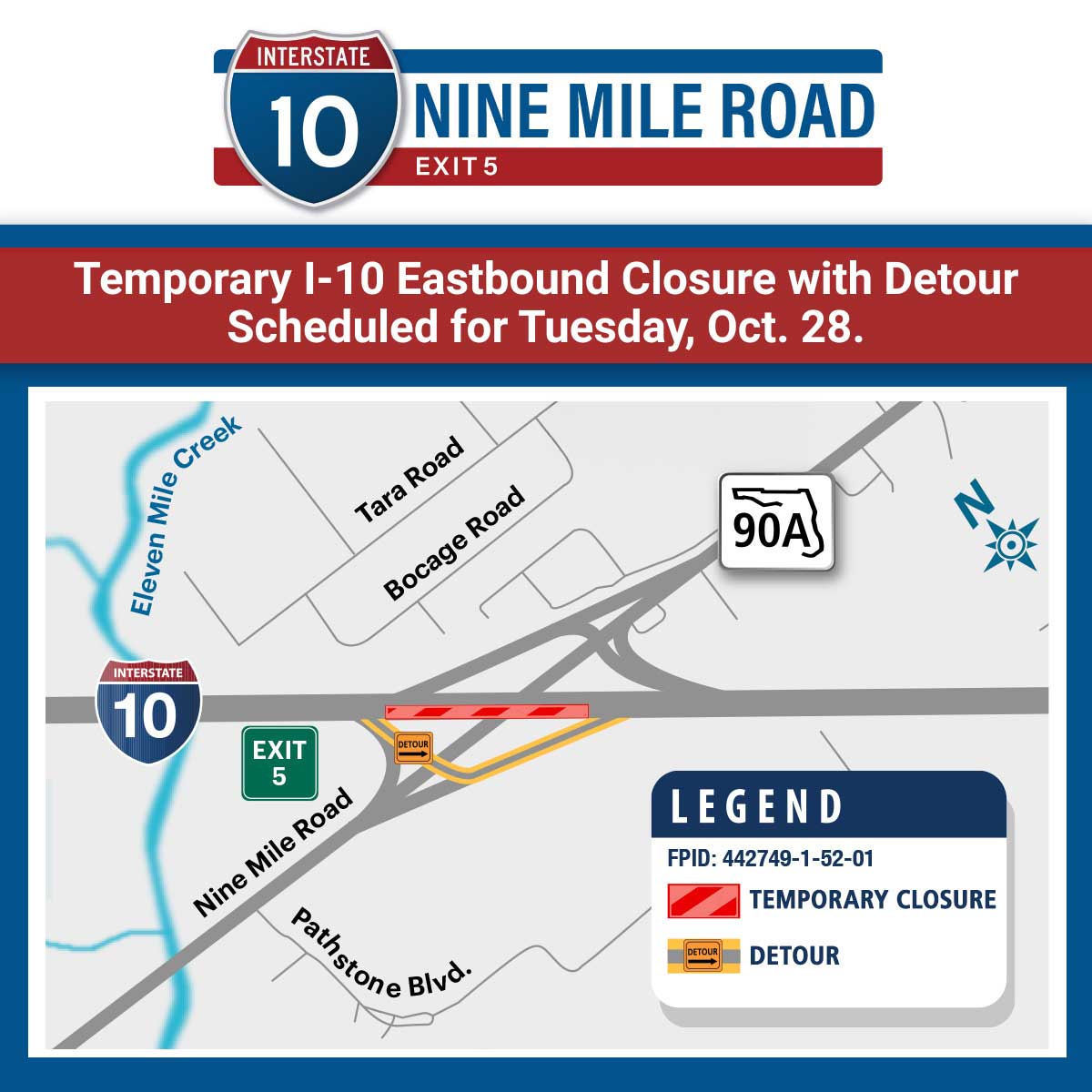 I-10 eastbound will be closed at Nine Mile Road (Exit 5) on Tuesday, October 28, from 8 p.m. to 6 a.m., for bridge beam placement operations.