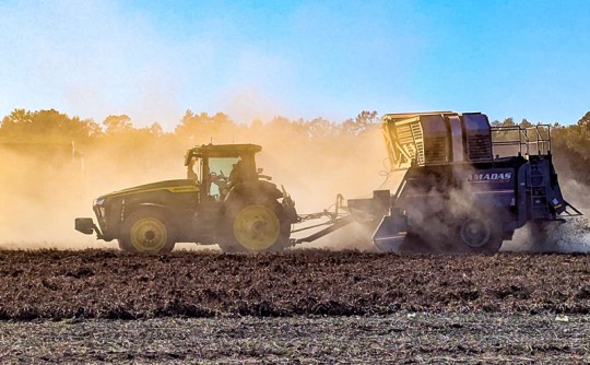 Pictured: Dust rises as peanuts are harvested in Walnut Hill. NorthEscambia.com photo, click to enlarge.