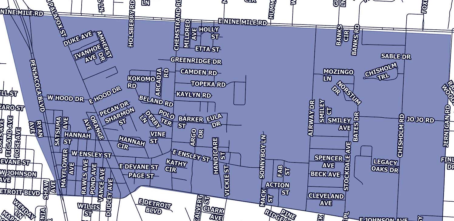 Only residents in the designated cleanup area can participate in the neighborhood cleanup. Items for pickup should be at the curb by 7 a.m. on Wednesday. Items left at the curb outside of the cleanup area will not be collected. (Click map above to enlarge.) The area is general south of Nine Mile Road south to Johnson Avenue and from Pensacola Boulevard to Jernigan Road.