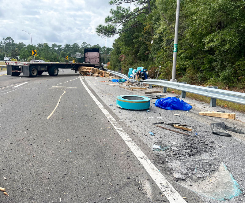 About 11:25 a.m. Friday, a tractor-trailer heading west from northbound I-110 to I-10 lost its load, which completely shut down the interstate ramp and resulted in heavy damage to the roadway.
