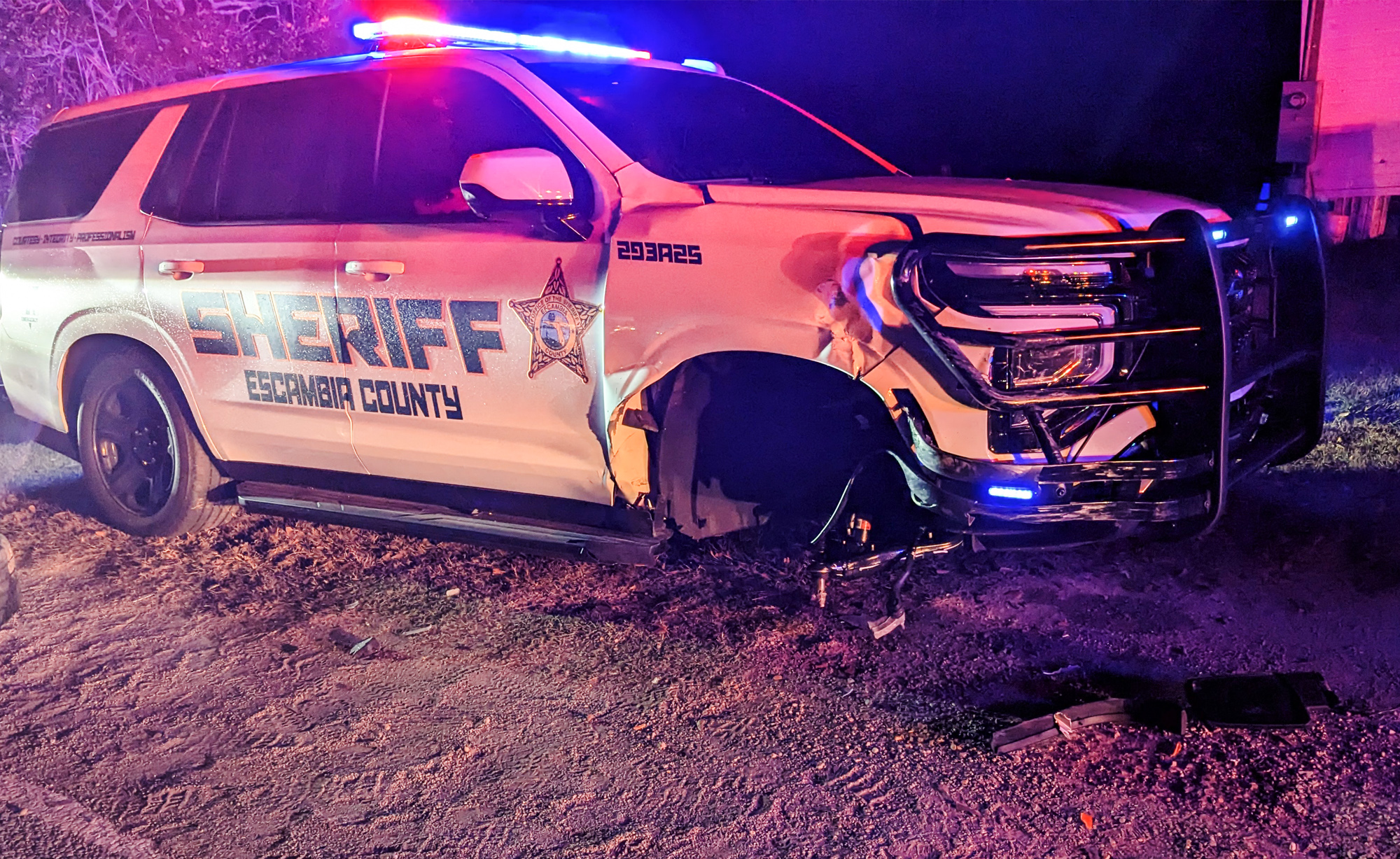 A driver crashed her pickup truck into three Escambia County Sheriff’s Office vehicles Thursday night in Bratt.