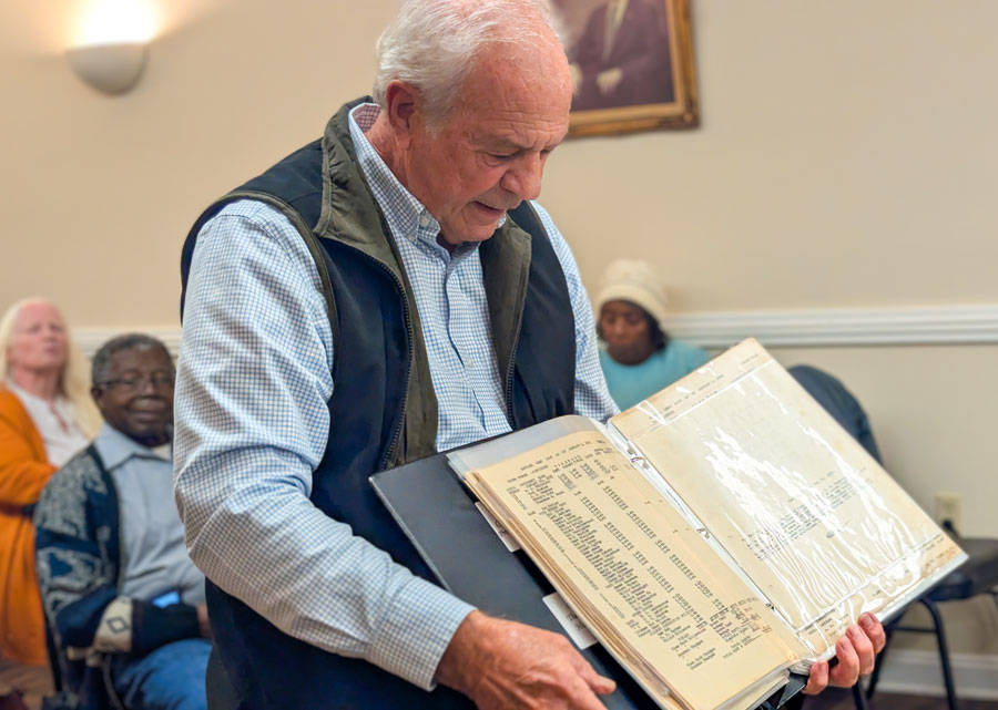 Pictured: Russell Brown of the Alger-Sullivan Historical Society shows a ledger book from their Leach House Museum collection. THe leger book documents early housing records from just after the turn of the 20th century. NorthEscambia.com photo, click to enlarge.