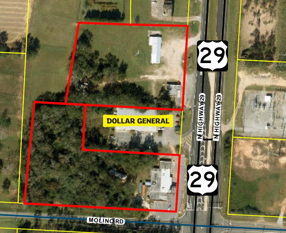 The second parcel, located to the north of the first and separated by Dollar General, is 3.321 acres and contains the Molino Food Mart and a tire store.