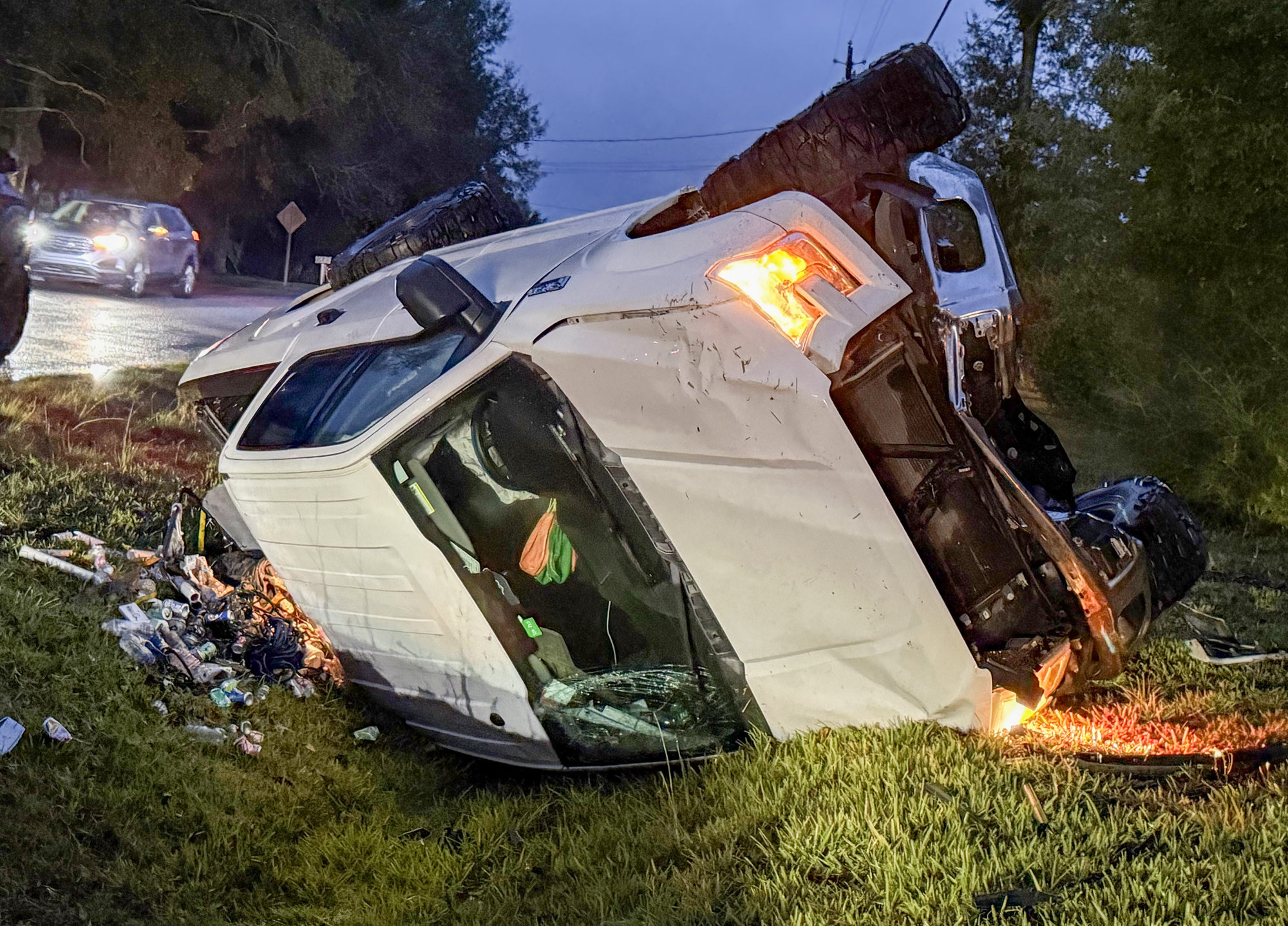 Two pickups collided near the intersection of Tate Road and Kingsfield Road. One pickup came to a stop after running into a ditch, the other overturned into a ditch.