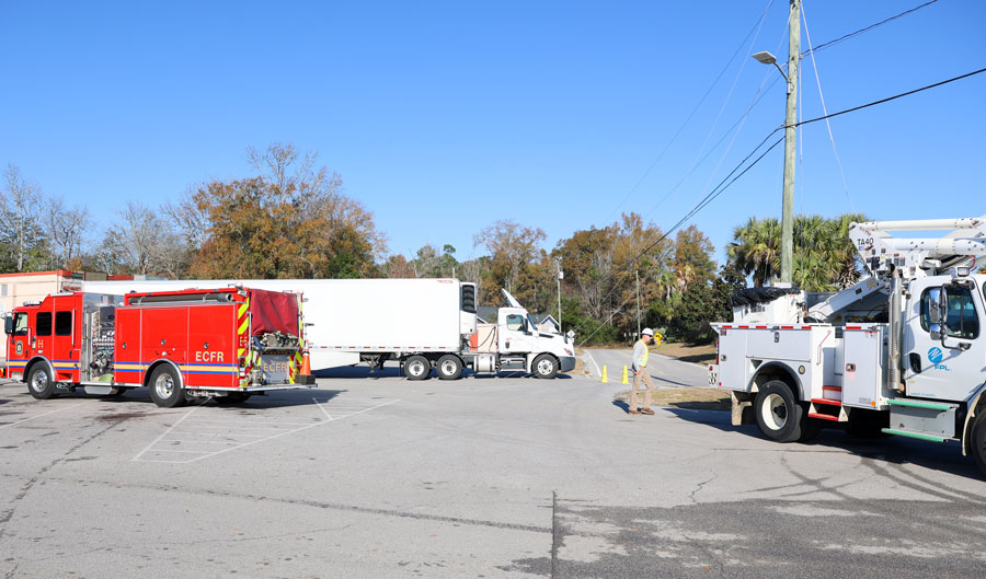 The driver remained in the truck as a precaution until FPL could arrive on scene and ensure that the lines were dead. The driver was not injured.