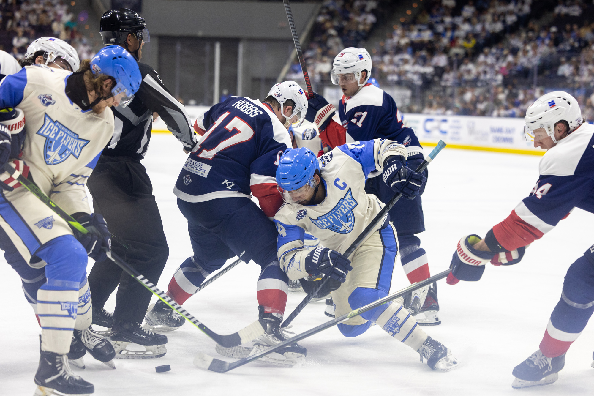 The Ice Flyers continued to push in the third period, refusing to let up. Midway through the frame, Matt Allen extended the lead to 3–1, giving Pensacola breathing room and sending the Hangar into a frenzy. From there, the Ice Flyers locked things down defensively and closed out the win to force a decisive Game 3.