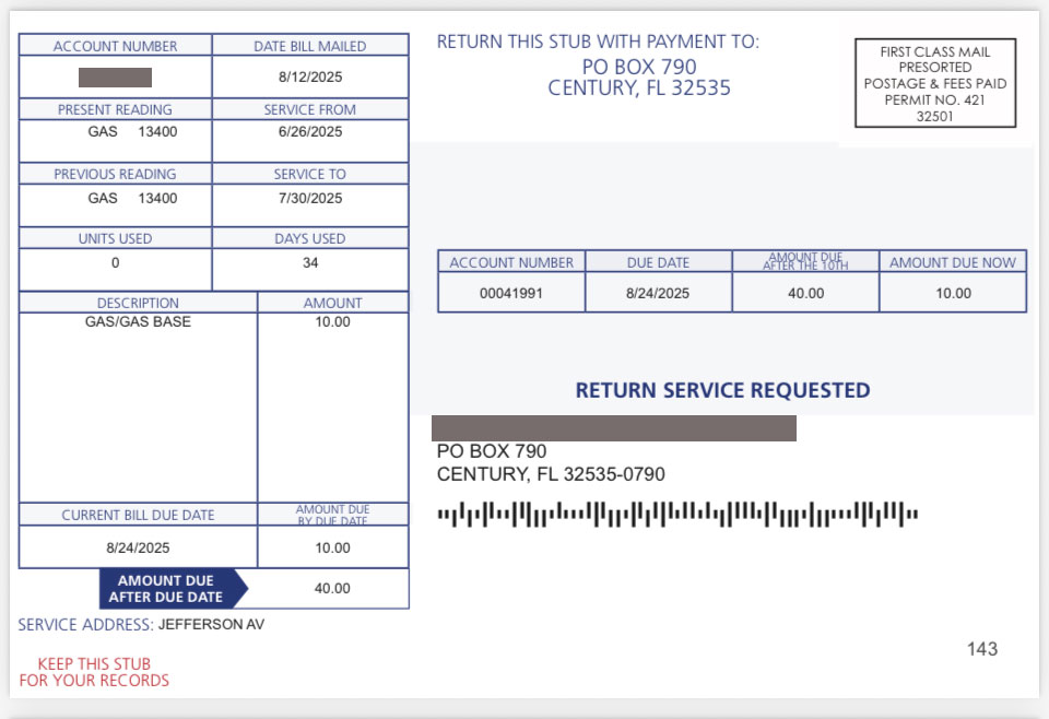 Pictured: A sample Town of Century utility bill. Image for NorthEscambia.com, click to enlarge.