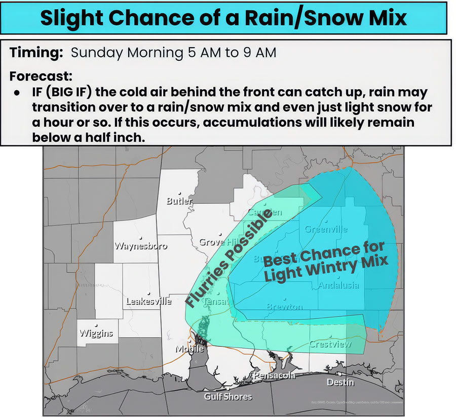 “Right now the most likely scenario is that a light, cold rain should begin to spread across much of the local area late this evening and into the overnight hours. As rainfall slowly pushes eastward, a transition to a wintry mix/snow is possible during a brief window generally between 5 a.m. and 9 a.m. Sunday morning,” NWS Mobile forecasters said.