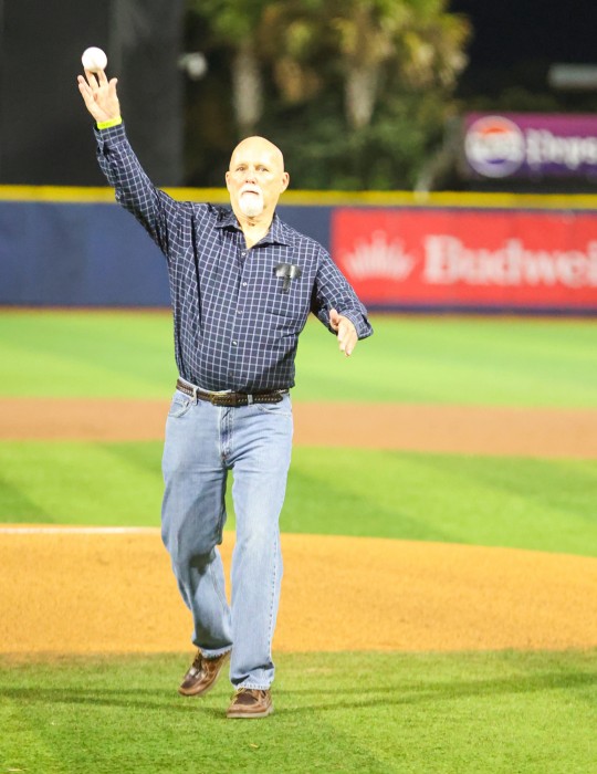 Ronnie Stryker, who was a senior on the 1976 state championship Tate Aggie team, threw out the ceremonial first pitch Friday night at Blue Wahoos Stadium.