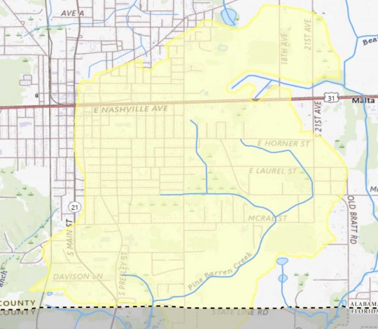 Atmore has received a $17 million grant from the USDA National Resources Conservation Service (NRCS) to reduce flooding in the Pine Barren Creek Watershed. The watershed drains a large portion of the city, essentially south of East Nashville Avenue (Highway 31) between South Main Street and 21st Avenue. (Click map to enlarge.)