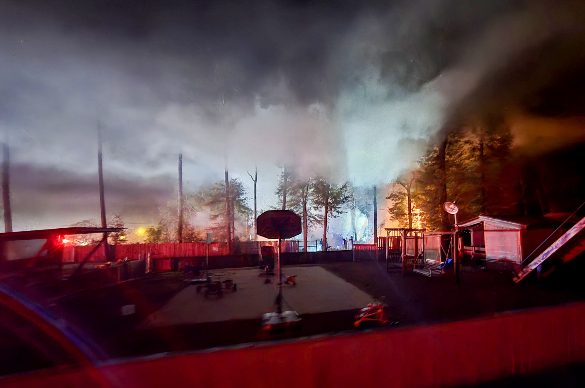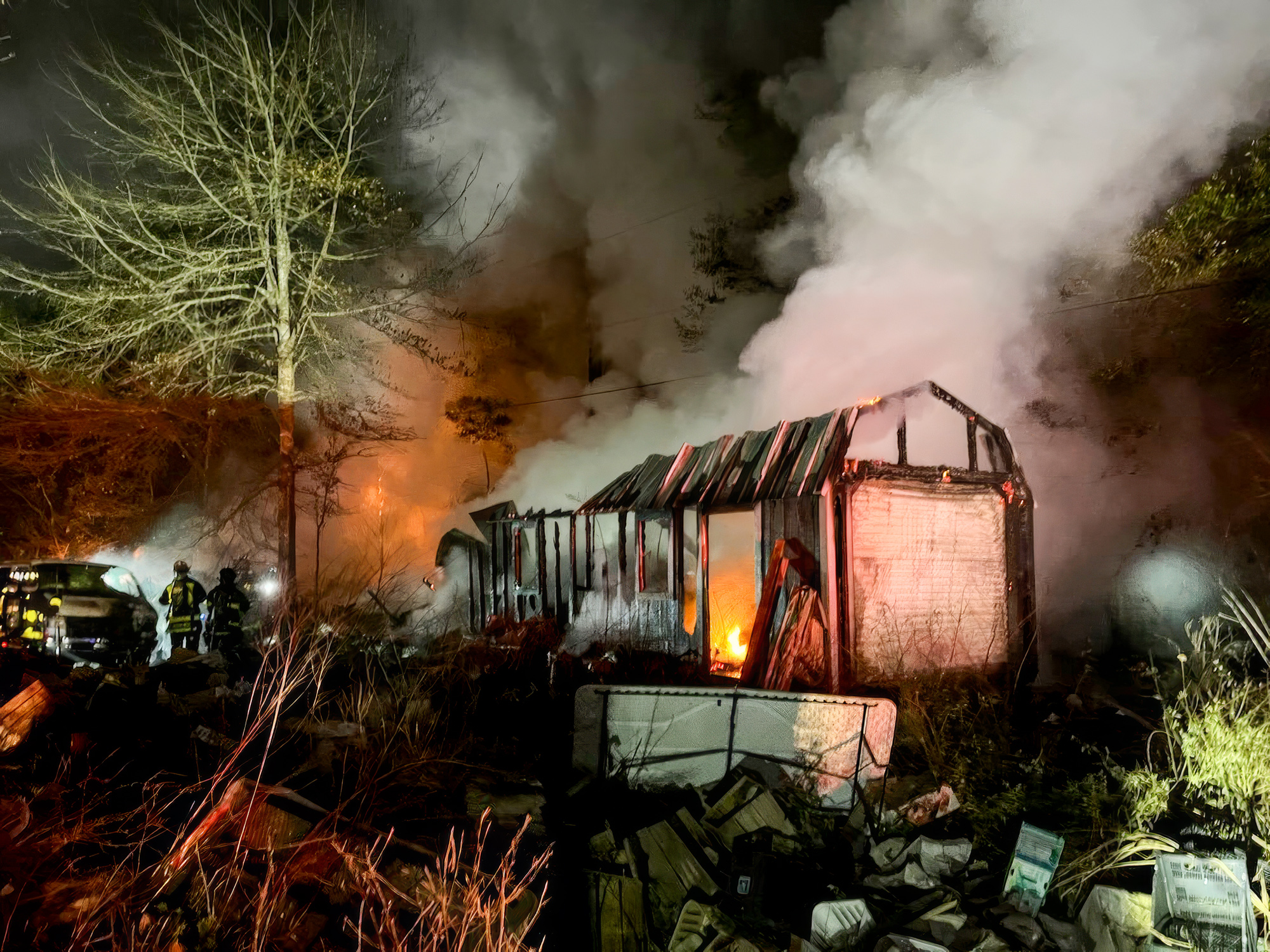 Escambia County Fire Rescue arrived to find two sheds and nearby vehicles on fire with one of the sheds already burned to the ground. Firefighters worked to prevent the flames from spreading to additional vehicles or a wooded area, and the fire was declared under control by 1:31 a.m.
