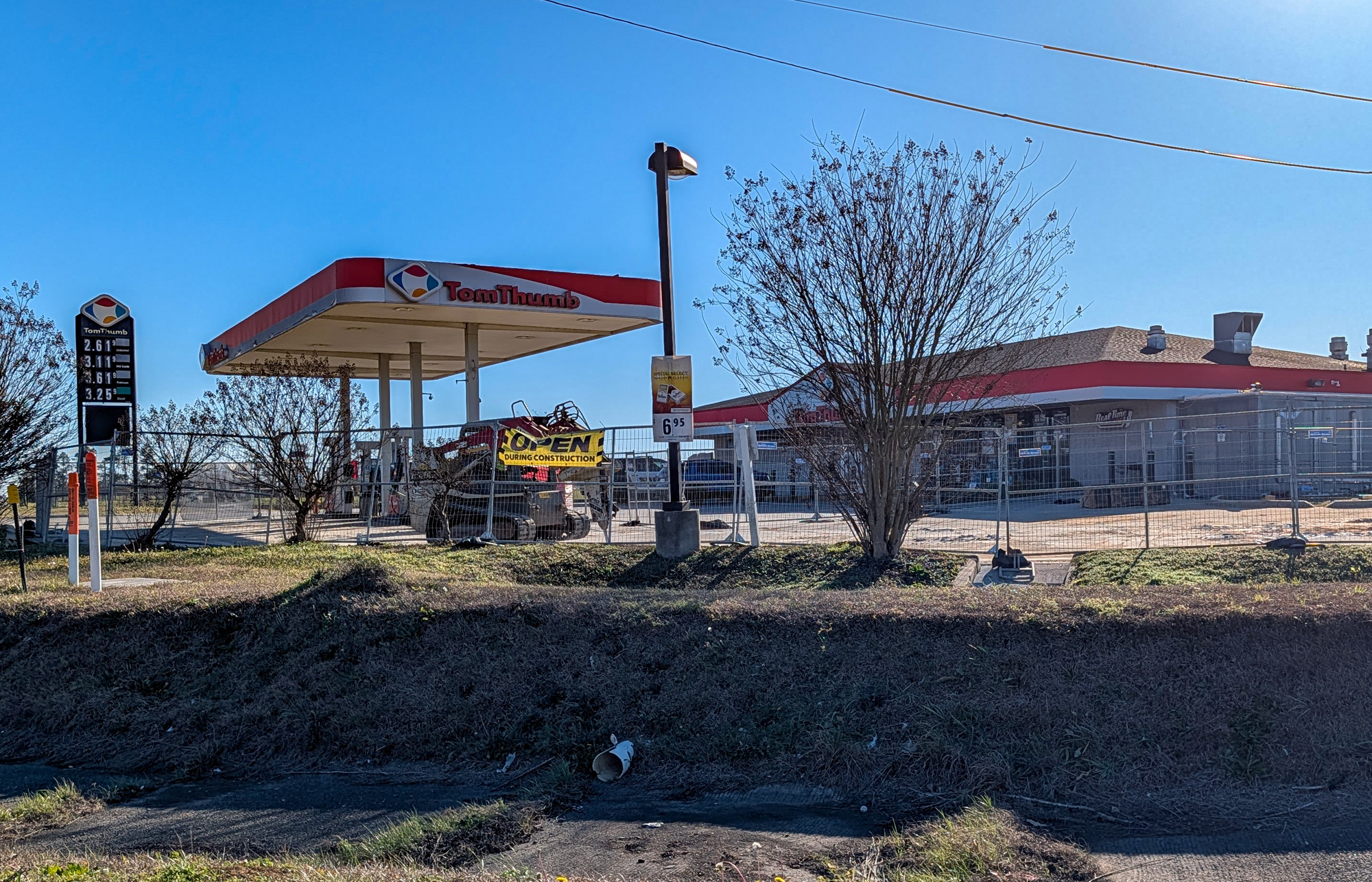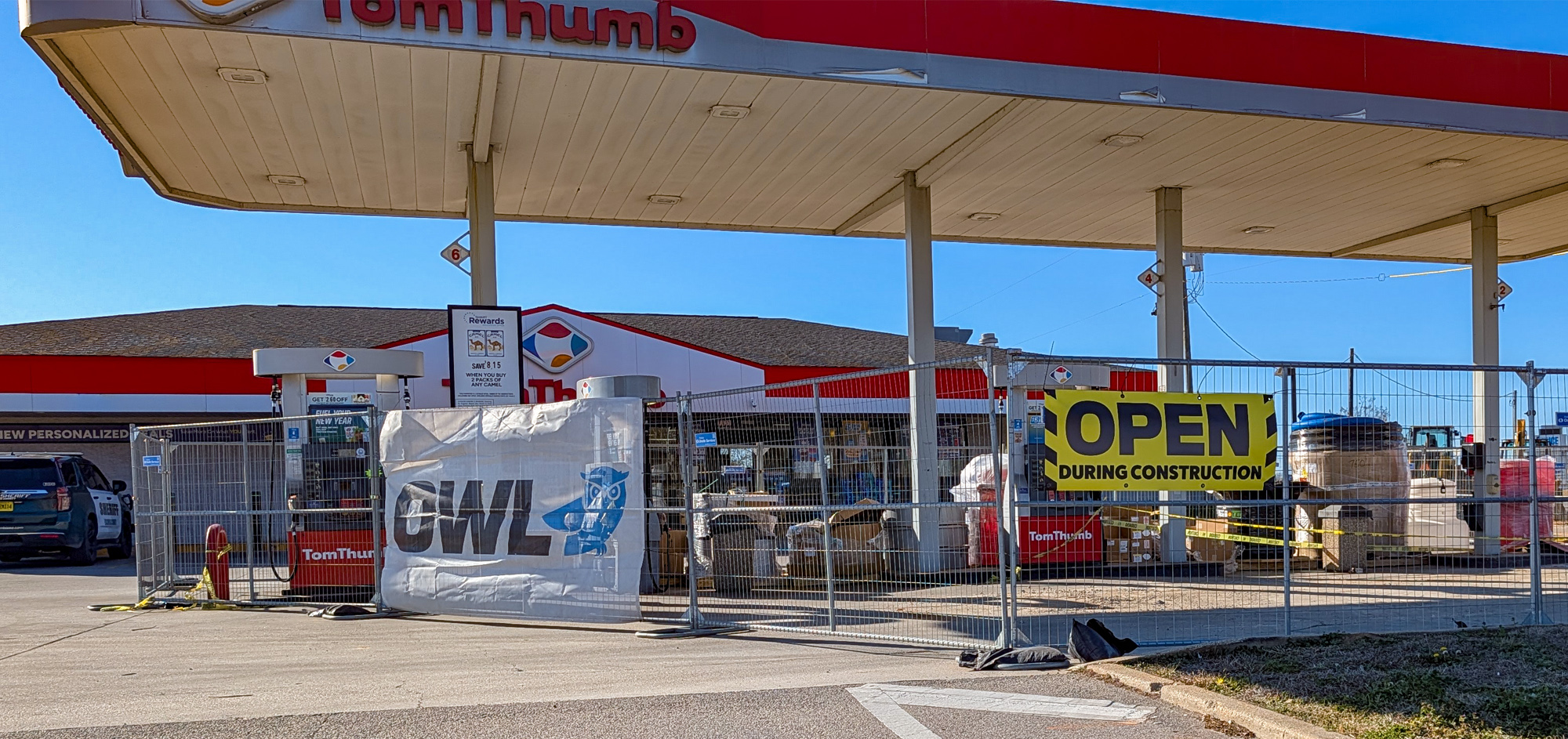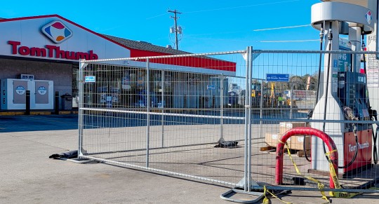 Construction fencing surrounds a portion of the Tom Thumb in Molino, with gas pumps blocked off.