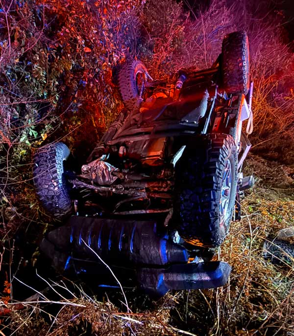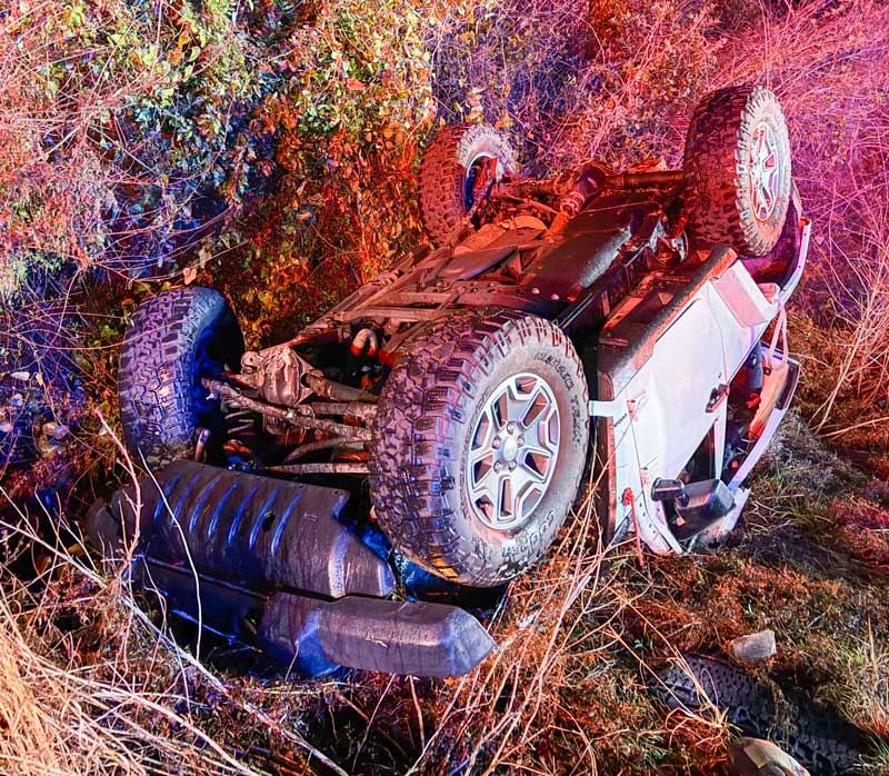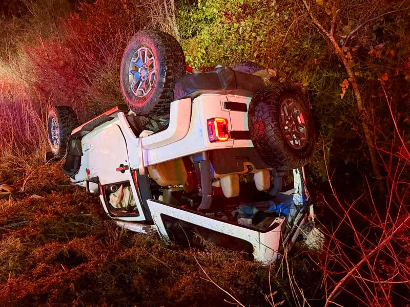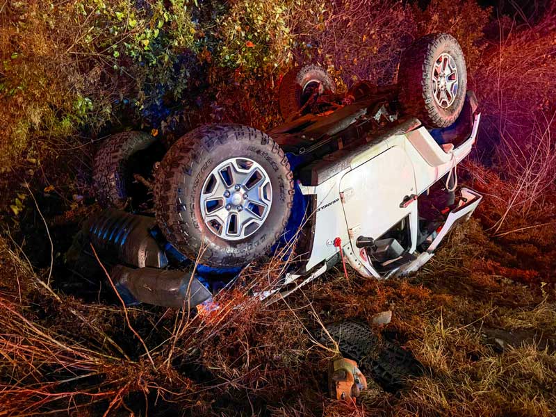 The crash occurred about 8 p.m. on Highway 95A near Archer Road. The driver of a Jeep lost control and overturned off the roadway. The engine compartment caught fire, but the occupants were able to safely escape the vehicle.