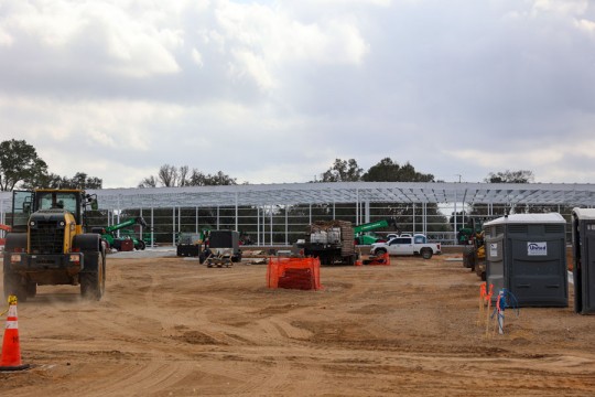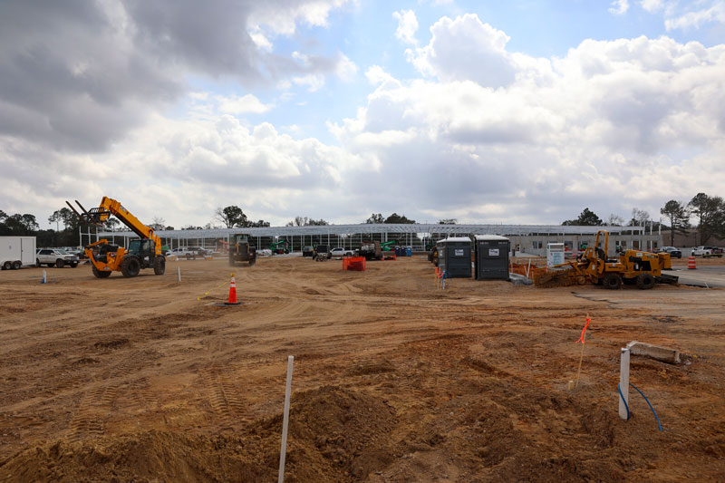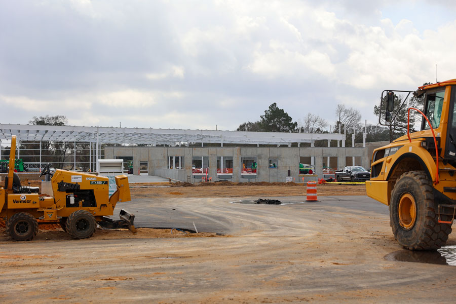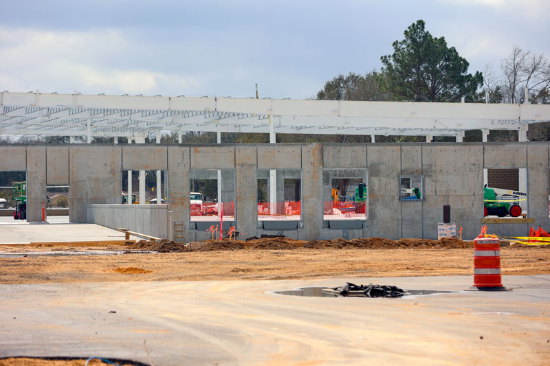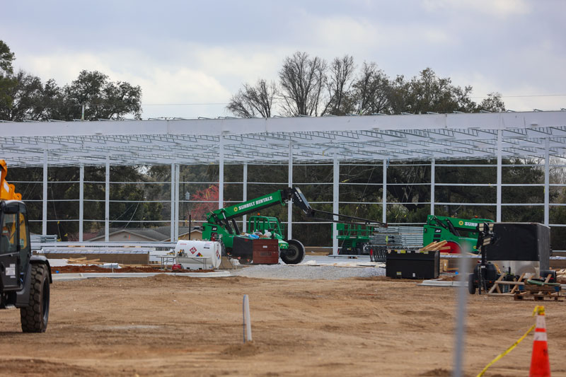 Since work began late last year, the previous shopping center has been demolished, foundation work has been completed, and workers have erected the steel frame and a few exterior walls.