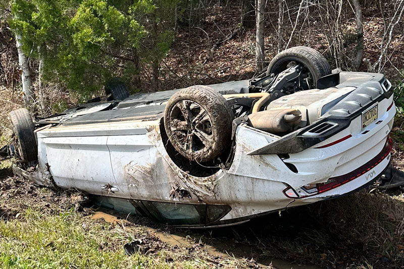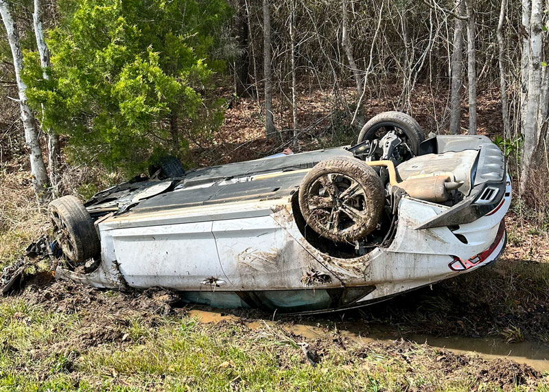 About noon, the driver of a Kia sedan lost control, left the roadway, and overturned in a muddy ditch alongside Highway 29 near Bogia Road.