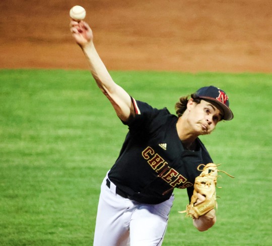 Starting pitcher Grayson Burns earned the win for the Chiefs, surrendering four hits and one unearned rn in five and two-thirds innings, while striking out nine and walking one. Bryant Mason pitched one and one-third innings with no hits and no runs, walking two and striking out three.