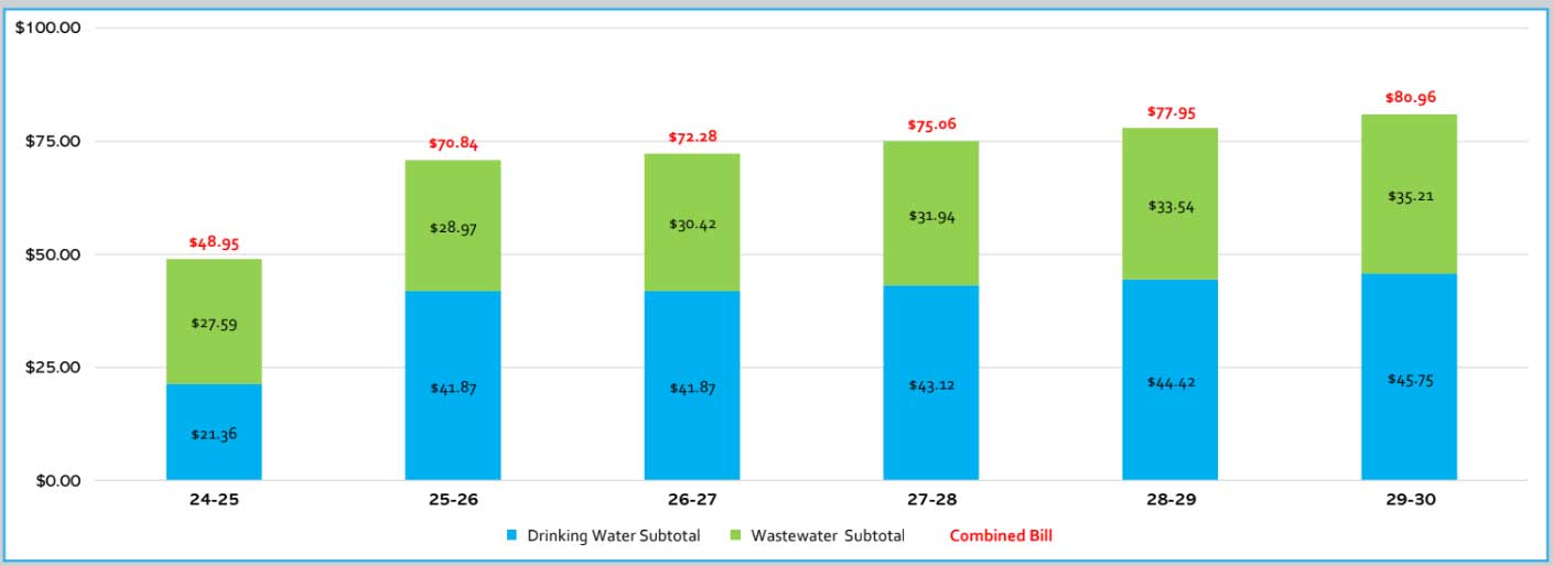 The average user consuming 5,000 gallons per month would see their water and wastewater bill increase from a current $48.95 to $61.01 in April and eventually $81.95 in 2029 for water and wastewater.