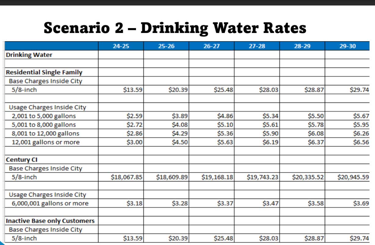 The first scenario would double the current base rate for 2,000 gallons from the current $13.59 to $26.64 beginning April 1 and continue for three years before incremental increases to $29.11 in 2029. Usage tiers over 2,000 gallons a month would increase nearly double up to 5,000 gallons (from $2.59 to $5.08) with other increases for additional usage.