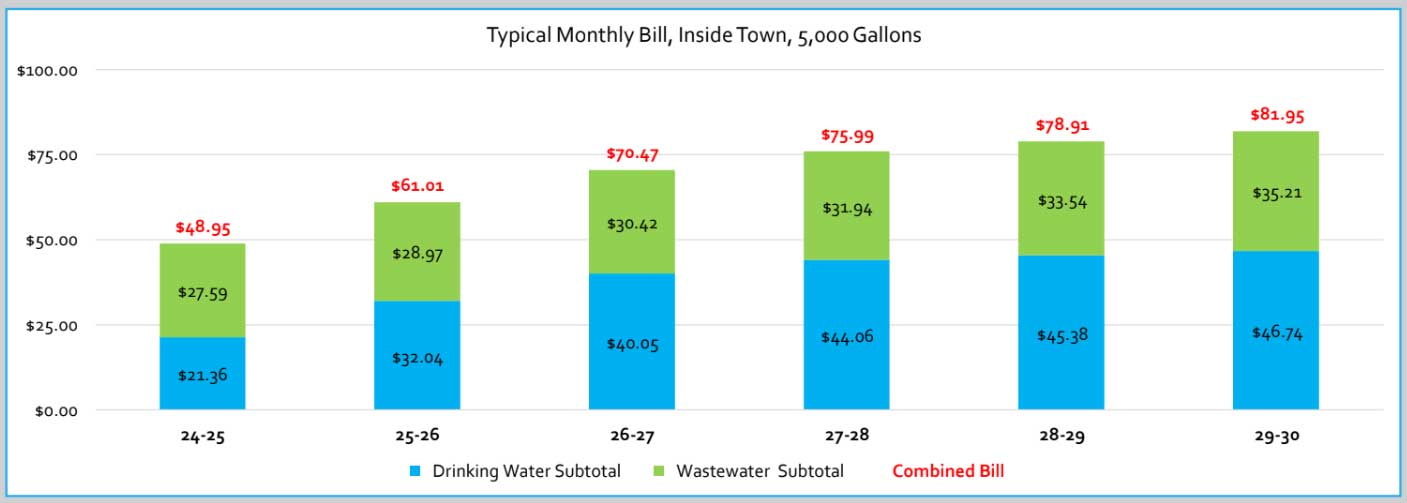 For an average customer using an average 5,000 gallons of water per month, the water cost would rise from $21.36 to $41.87 while the study says combined water and wastewater cost would rise from $48.95 per month to $70.84 in April, with additional increases to $80.56 by 2029. That study says that is comparable to other towns of similar size.