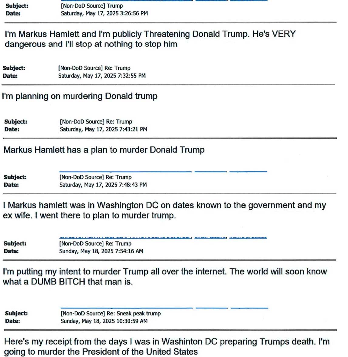 According to federal court documents, Hamlett made threats to the life of President Donald Trump via emails, phone calls, and in person.