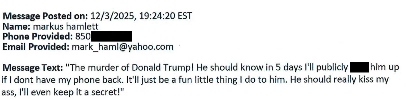 Records show he was also arrested in October 2025 in California for threats against the president after allegedly making a 911 call and advising that he had “a great plan to assassinate Donald Trump.”
