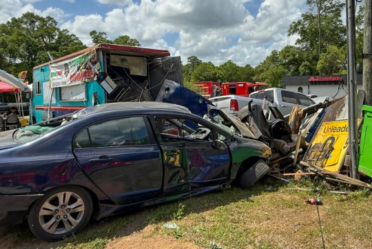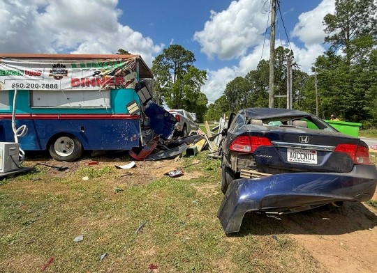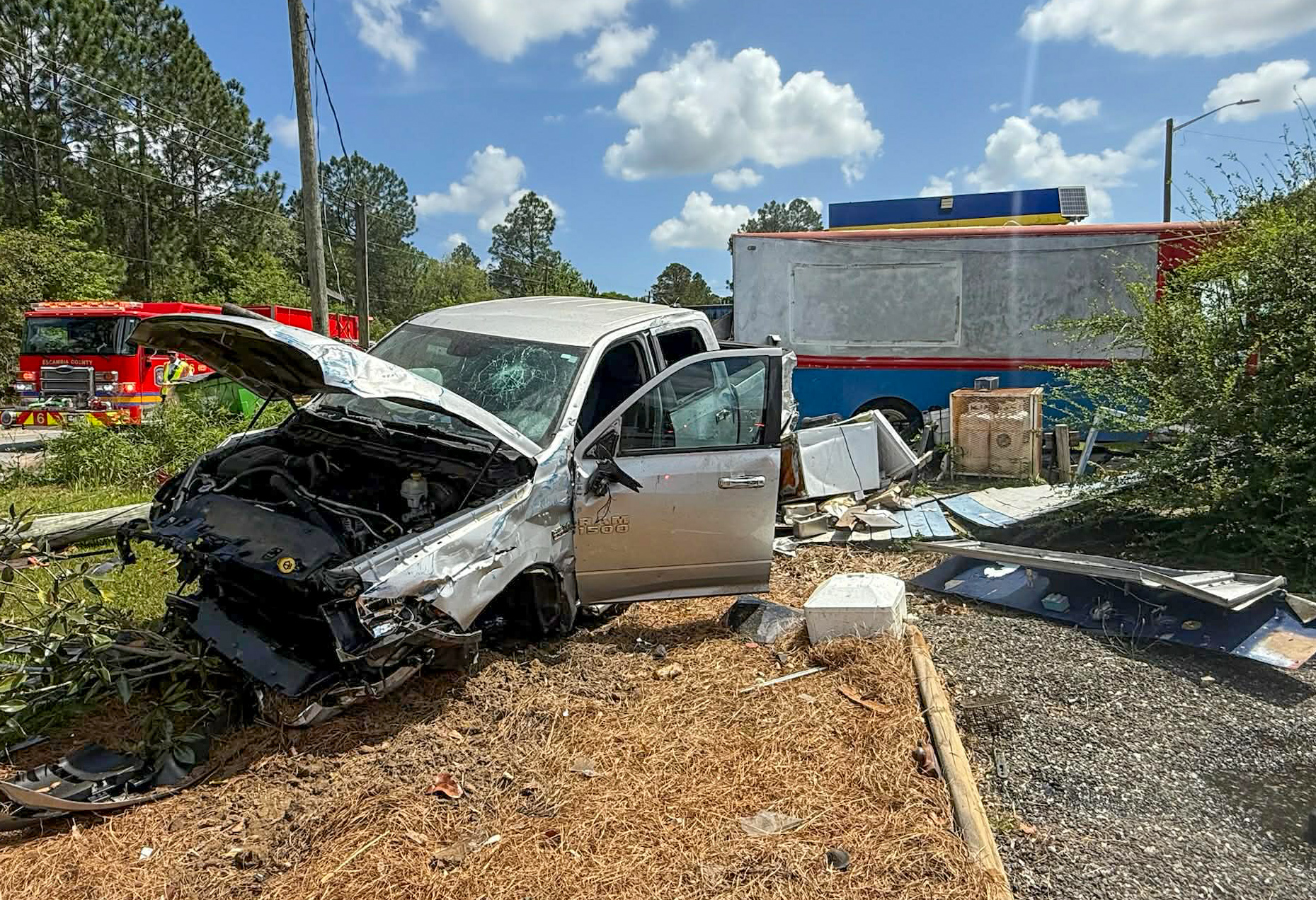 Around 1:20 p.m., the driver of a silver Dodge Ram pickup apparently rear-ended another pickup truck on Highway 95A behind the Speed Mart on Highway 29 at Tate School Road. The silver pickup truck then went through the parking lot of the gas station and struck at least two parked vehicles. The silver pickup then crashed through the end of a food truck, pushing into a second food truck. The truck also struck signage, a large smoker grill and other items, and brought down a power pole.