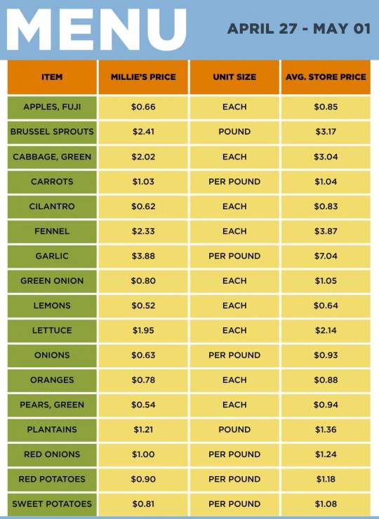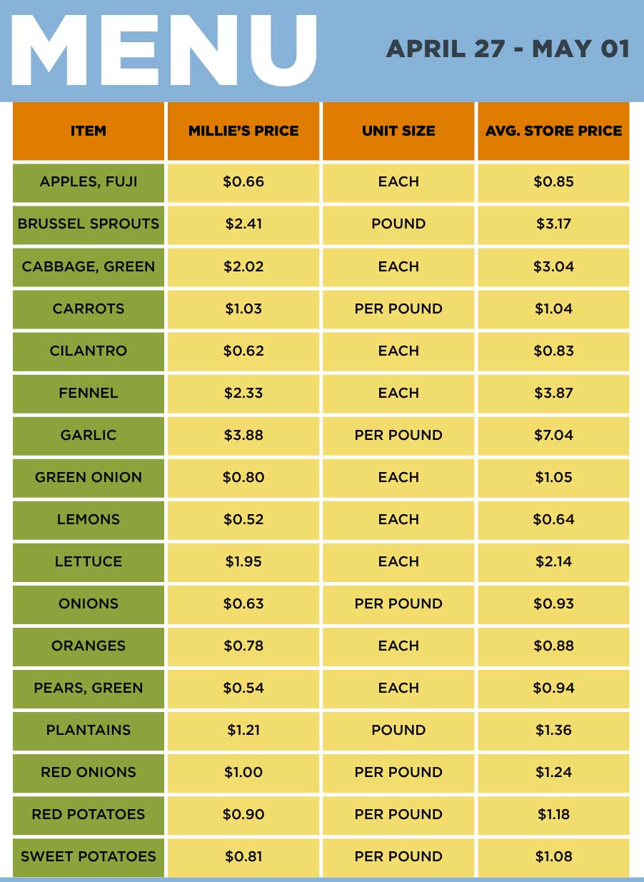 During the Molino visits, Millie will offer a menu of fresh produce at discounted prices (see list below).
