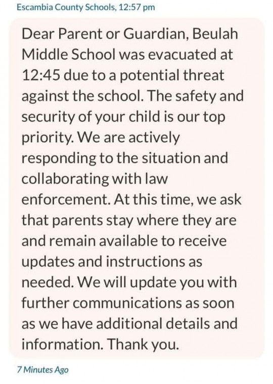 When a bomb threat was received Monday for Beulah Middle School, the Escambia County Public Schools notified parents within a few minutes.
