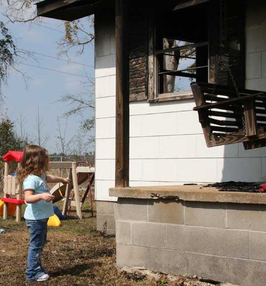 Pictured top of page: Three year old Elizabeth White stands in front of her burned out home. Pictured below: Elizabeth points toward her room. Pictured bottom of page: Tiffany White looks at the only family photos that she could find. NorthEscambia.com exclusive photos. Click to enlarge.