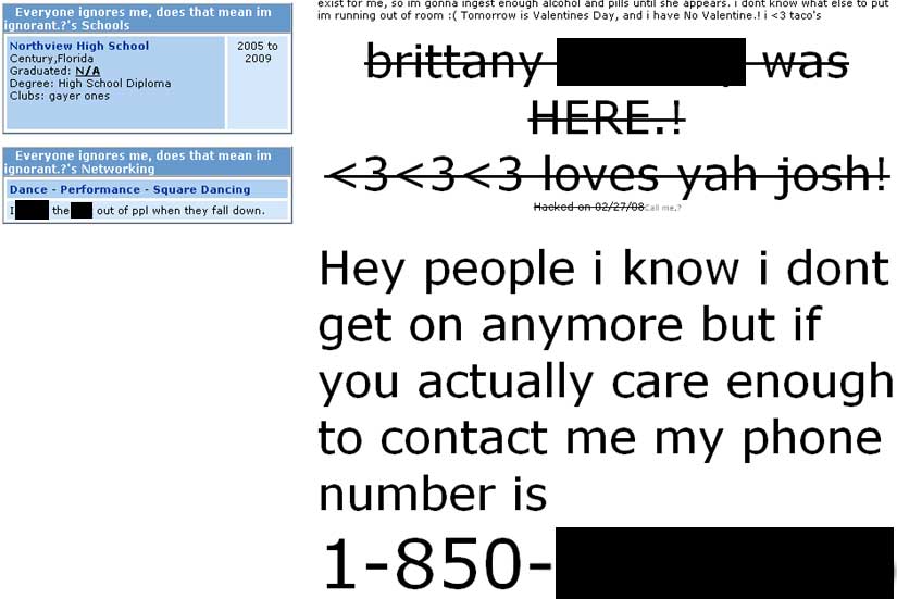 Another Northview student writes in large, bold print on his MySpace page: “my name is XXXX XXXX XXXXX, i go to northview high school, i am 15, my b-day is march XX, i play baseball, and football, i wear #XX in baseball, #XX in football, that is about it but if you want to know more write me some messageor call 850-380-XXXX.”