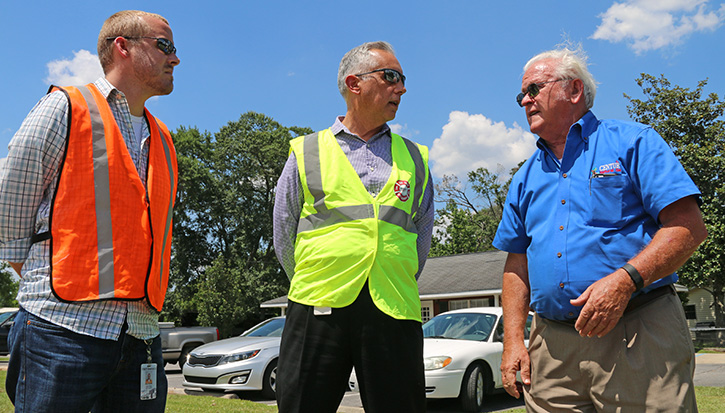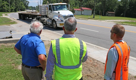Pictured: Century Mayor Freddie McCall (blue shirt) meet with Florida Department of Transportation Traffic Safety Engineer Michael Lewis (yellow vest) and FDOT Traffic Safety Specialist Matt King about a dangerous curve on North Century Boulevard. NorthEscambia.com photos, click to enlarge.
