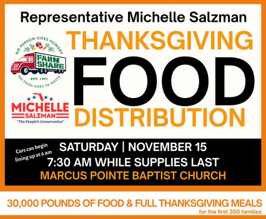 Rep. Michelle Salzman, in partnership with Farm Share and Marcus Pointe Baptist Church, will host a Thanksgiving Food Distribution on Saturday to support local families in need this holiday season.