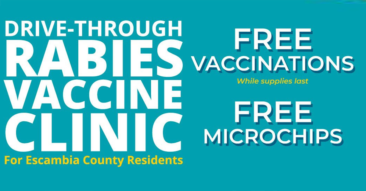 The Escambia County Department of Animal Welfare and the Florida Department of Health in Escambia County will hold a free drive-through rabies vaccine clinic for dogs and cats Saturday, November 1.