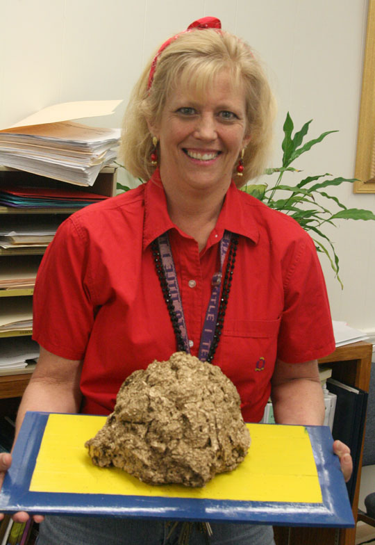 Pictured: Escambia County’s Principal of the Year, Nancy Gindl-Perry from Ernest Ward Middle School. Pictured below: Perry received the “Golden Cow Dung Award” earlier this year. NorthEscambia.com photos, click to enlarge.