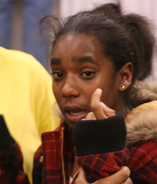Pictured top: Freedom Thomas tried to comfort her daughter Keyvinana Johnson as she cries after a Thursday night school board meeting at Carver/Century K-8 School. Keyvinana was upset that her school will likely close. Pictured middle: Keyvinana wipes tears from her eyes. NorthEscambia.com photos, click to enlarge.