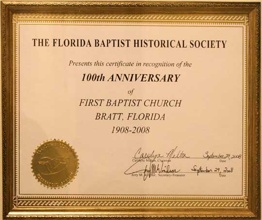 The First Baptist Church of Bratt celebrated its 100th anniversary recently.