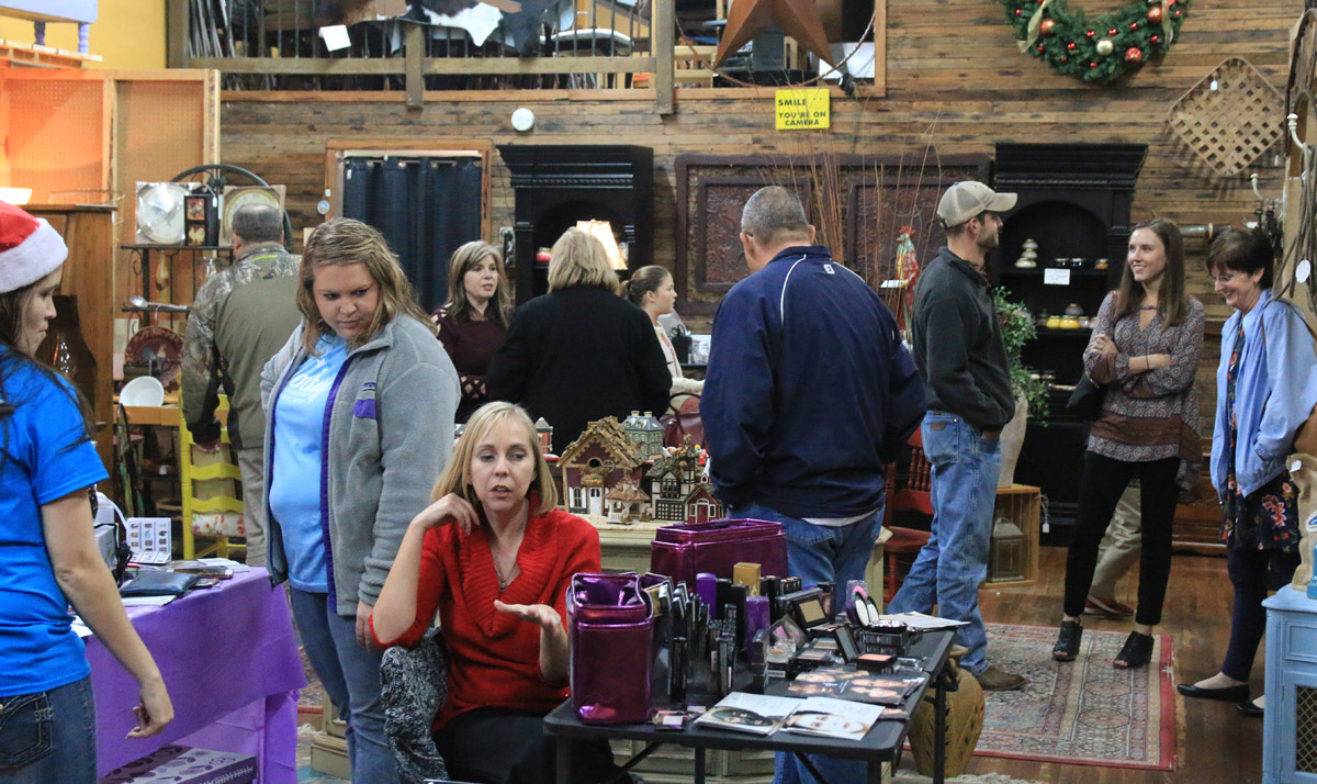 Pictured top: Visiting with Santa during Santa on Main in Atmore Thursday night. Picture below: Shoppers check out the unique finds at Southern Additions Antiques and Consignments. Pictured bottom: Carolers sing traditional Christmas songs at Vin-Tiques on Ridgely Street. NorthEscambia.com photos, click to enlarge.