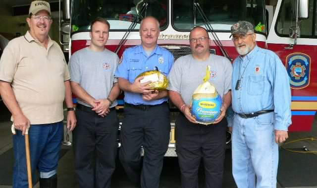 The Escambia River Muzzle Loaders stopped by the Cantonment Station of Escambia Fire Rescue with a donation Monday. They donated a turkey, spiral ham and $200 for the Escambia County Professional Firefighters Local 4131 burn fund charity. Courtesy photo for NorthEscambia.com, click to enlarge.