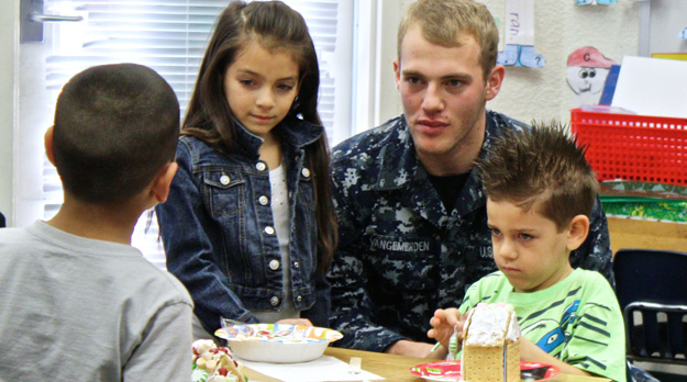 Pictured top: Ean Van Gemerden shares a welcome home hug with his niece and nephew, Penelope and Riley Saxton. Pictured inset: Penelope and Riley’s mother, Ayla Van Gemerden (holding their little brother),and Ean Van Gemerden’s mom, Sara Exner, look on. Pictured below: Van Germerden visits helps with a gingerbread project. Photos for NorthEscambia.com, click to enlarge.