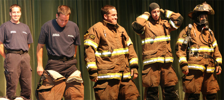 Students at Flomaton Elementary School got a lesson in fire safety Tuesday morning. Flomaton Fire Lt. Jeremy Lee (pictured) demonstrated how a fireman might look when rescuing a child from a burning home. The children also learned about “Stop, Drop and Roll”, fire prevention and had the opportunity to meet Smokey the Bear.