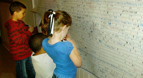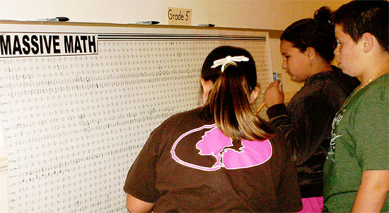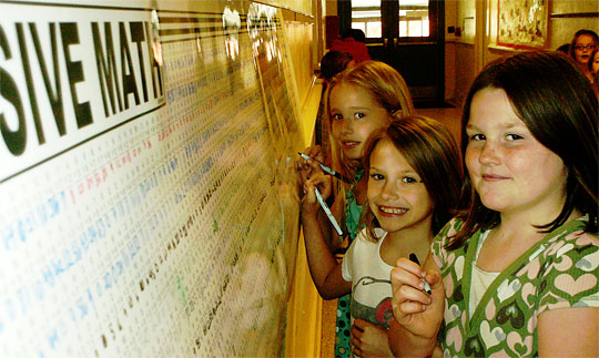 Byrneville Elementary students have taken on the Massive Math 20,000 Challenge. Kindergarten-fifth grade students are solving addition, subtraction, multiplication, division and fraction problems on a School 3×6 foot posters. Each poster has just over 4,000 problems.
