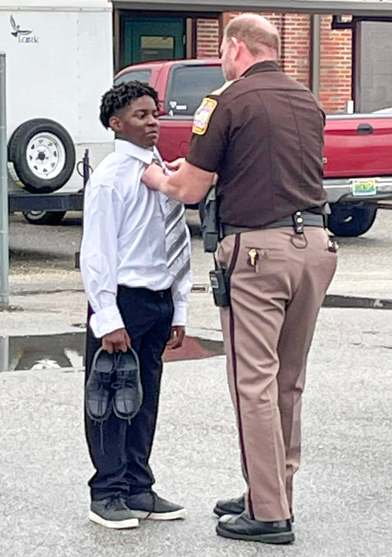 Enter the school resource officer, Escambia County (AL) Sheriff’s deputy Randall Gulley and his Windsor knot tie-tying skills. Some over, under, through, around, or something like that. There are 11 steps; we looked that up. Or maybe the deputy tied a half-Windsor knot. That has nine steps, so it’s not really half.