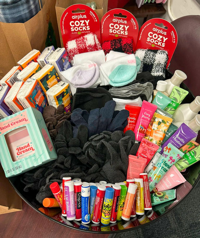The donations—including socks, lip balms, gloves, tissues, and lotions—were delivered Tuesday afternoon.