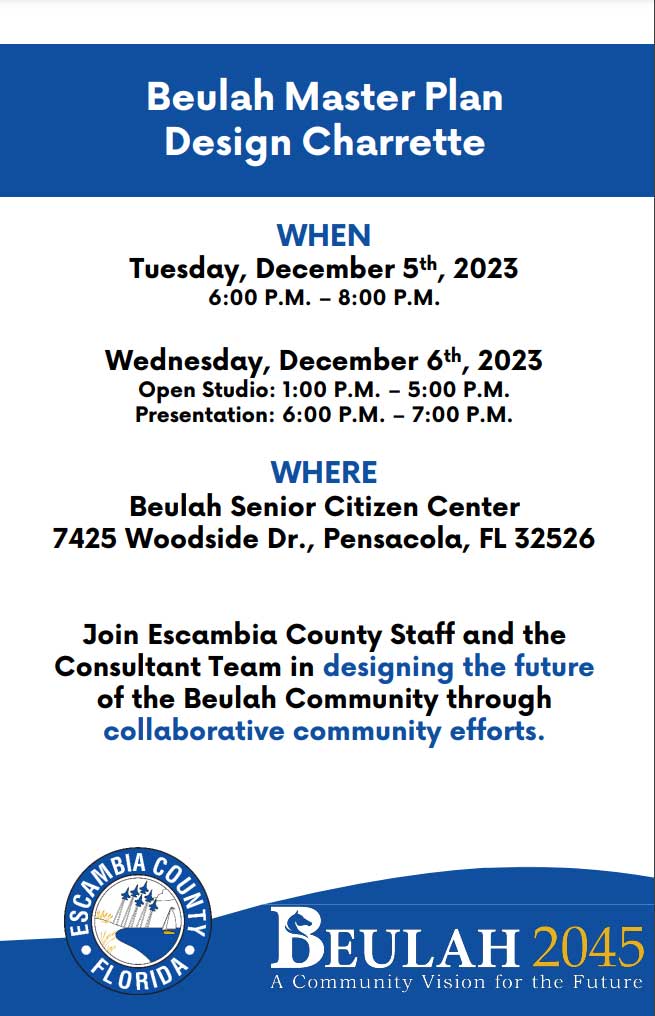 Escambia County District 1 Commissioner Jeff Bergosh, county staff and Sigma Consulting invite the public to the Beulah Master Plan Design Charette Tuesday, Dec. 5, and Wednesday, Dec. 6, at the Beulah Senior Citizens Center, 7425 Woodside Road.